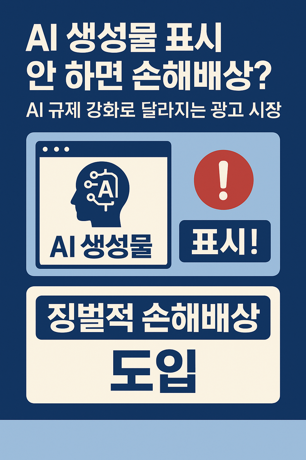 🧭 목차AI 시대, 왜 ‘표시 의무제’가 필요할까AI 생성물 표시 미이행 시 어떤 문제가 생기나허위·과장 광고에 징벌적 손해배상 도입콘텐츠 제작자·마케터가 꼭 대비해야 할 변화 AI로 만든 콘텐츠가 넘쳐나는 시대, 이제는 그 진위를 구별하기조차 어려워졌습니다. 실제 후기처럼 보이지만 알고 보면 AI가 만든 문장일 수도 있고, 전문가가 조언한 것 같지만 자동 생성된 내용일 수도 있죠. 이런 혼란이 반복되면서 결국 정부가 강력한 규제를 꺼내 들었습니다. 바로 ‘AI 생성물 표시 의무제’와 ‘징벌적 손해배상제’ 도입입니다.AI로 만든 콘텐츠를 숨기면 단순한 주의·경고 수준이 아니라 실제 손해배상까지 이어질 수 있는 시대가 열린 셈입니다. 이번 글에서는 해당 규제가 어떤 의미인지, 앞으로 콘텐츠 제작자와 광..